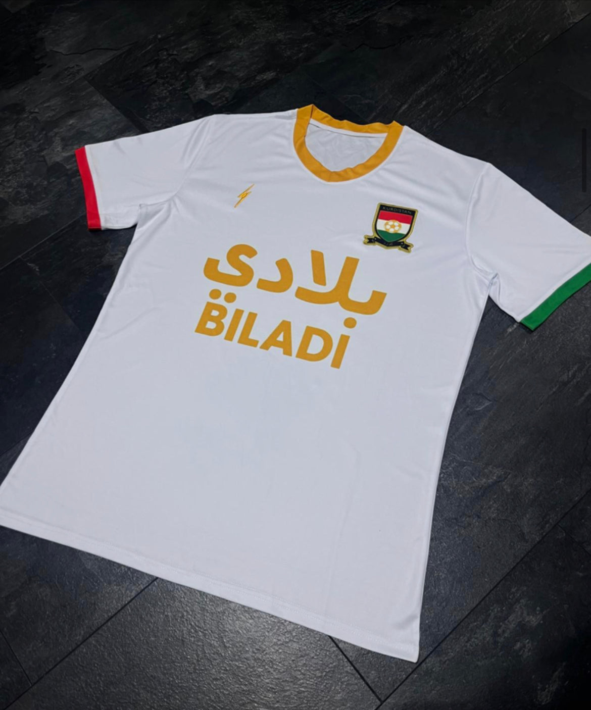 The Kurdistan home football kit is a striking blend of simplicity and cultural pride. The jersey features a clean white base, accented with bold details that honor the Kurdish identity. A golden-yellow collar adds a regal touch, complemented by matching sponsor and text in both Arabic and Latin script across the chest. The sleeves carry subtle but powerful symbolism: the right cuff in red and the left cuff in green, together representing two of the key colors of the Kurdish flag. Over the heart, the Kurdistan crest stands proudly, bordered in black with the iconic sun emblem at its center. Lightweight and breathable, this kit is designed for performance on the pitch while also serving as a proud statement for supporters off it.